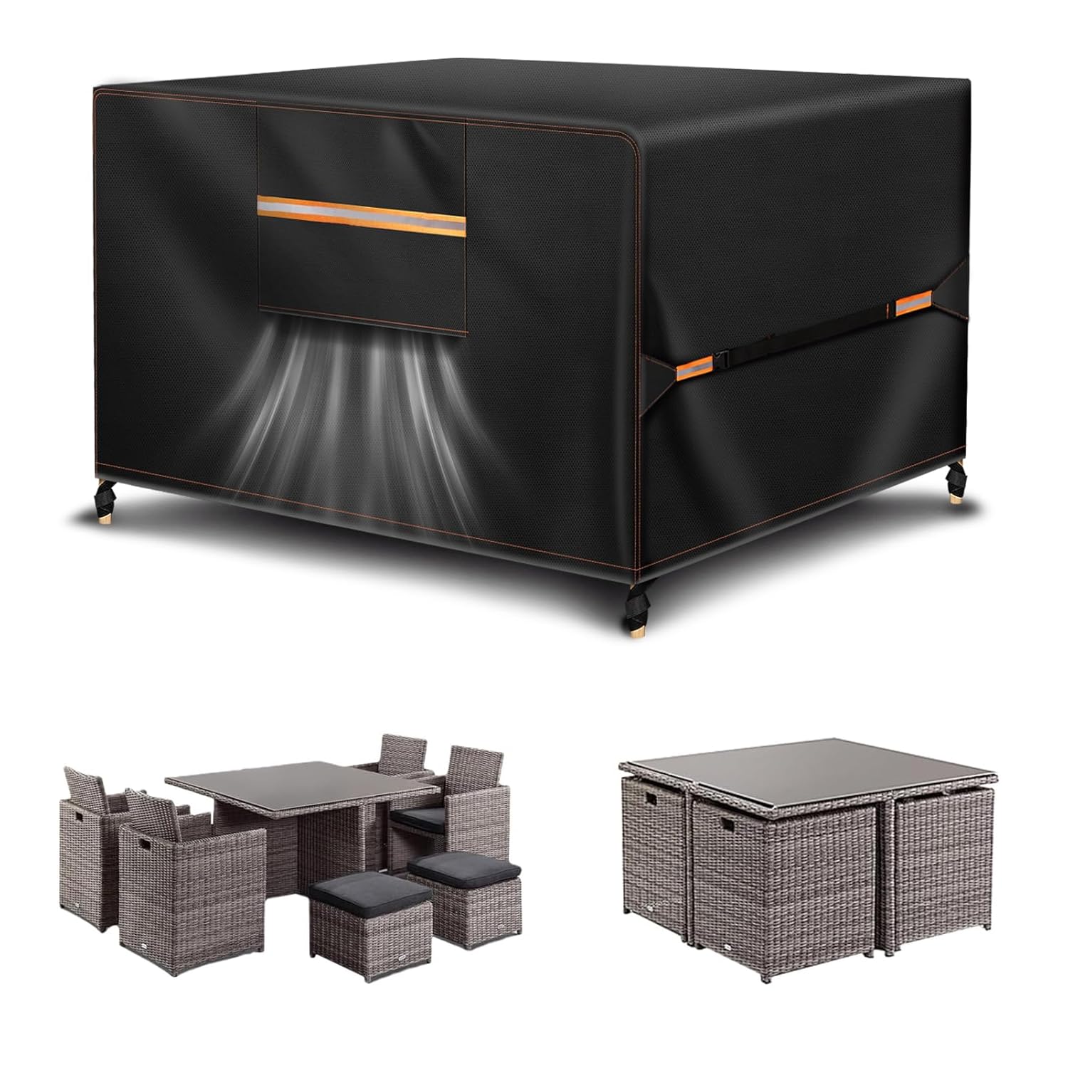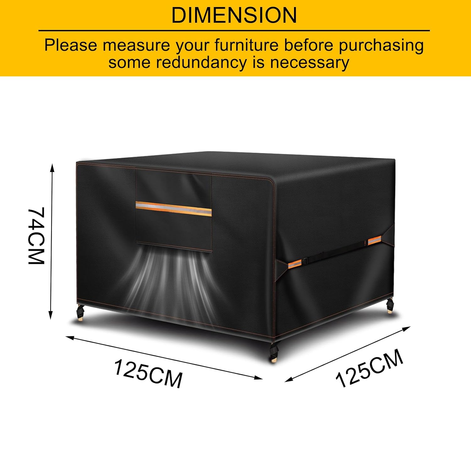 - 【DIMENSION】- L x W x H: 125 x 125 x 74 CM,The outdoor table cover waterproof fit for various types of indoor and outdoor furniture sets, including dining sets, rattan furniture sets, picnic tables, sofa sets, coffee tables, and more. “Before making your purchase, please ensure to measure your furniture set to ensure a proper fit, some redundancy is necessary”