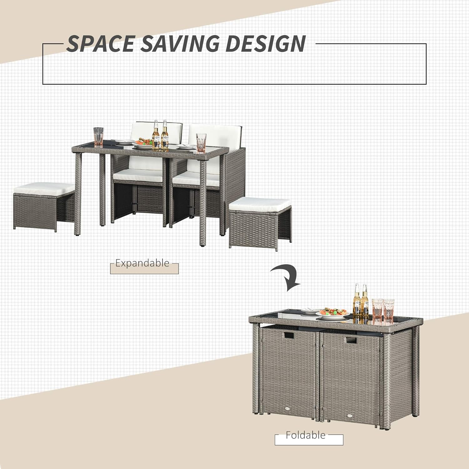 - SAPCE SAVING: Chairs and footrests of the rattan cube garden furniture can be stored under the table when not in use to save space. Foorests also can be used as stools