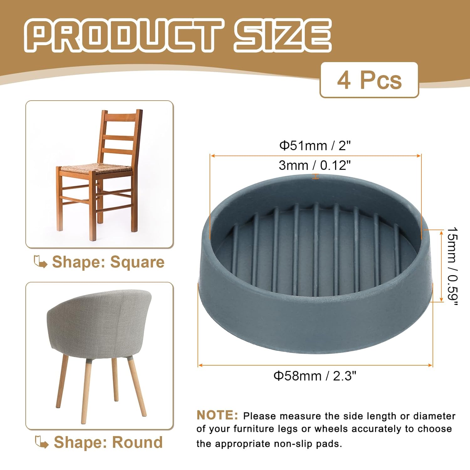 - NOTE: Please measure the side length or diameter of your furniture legs or wheels accurately to choose the appropriate non-slip pads