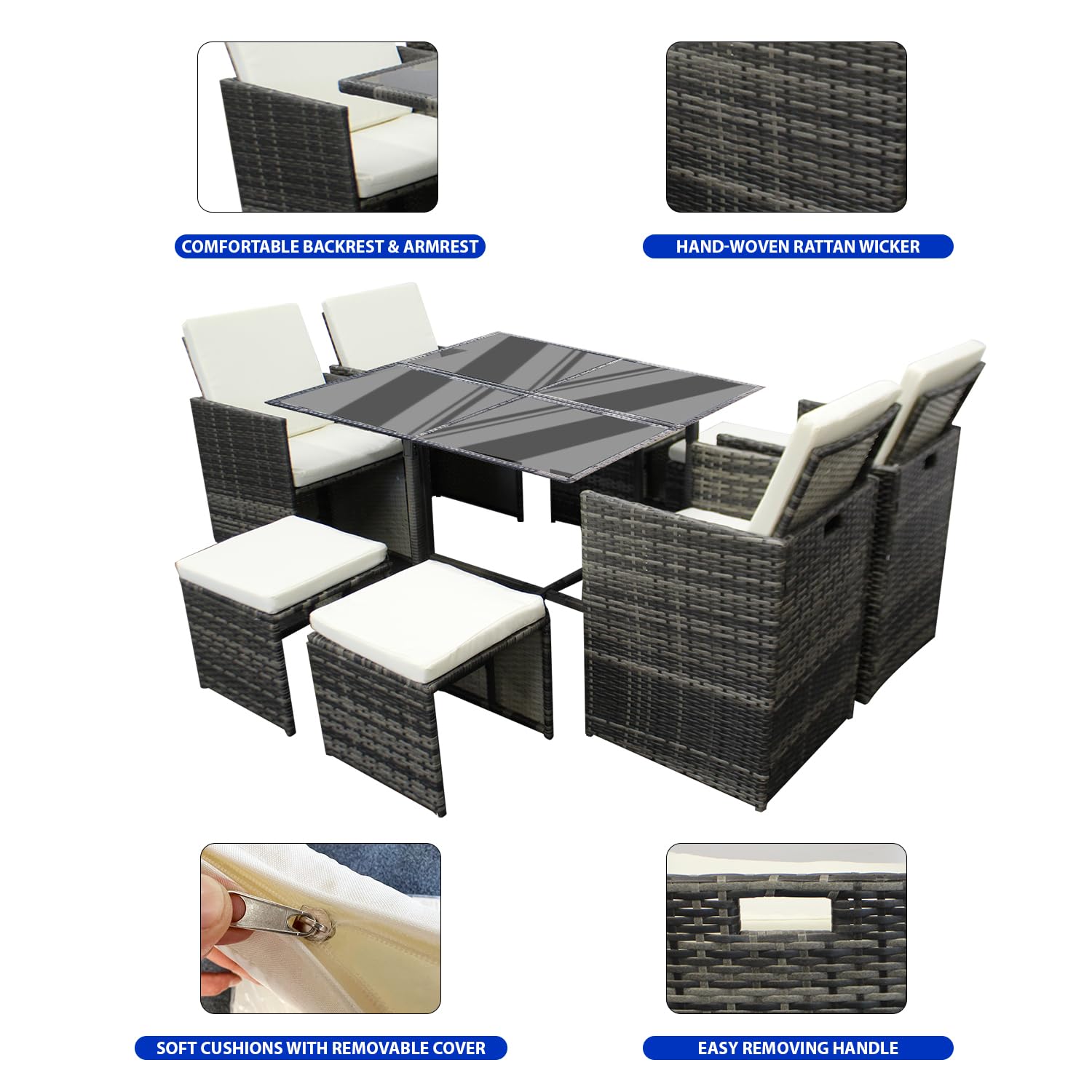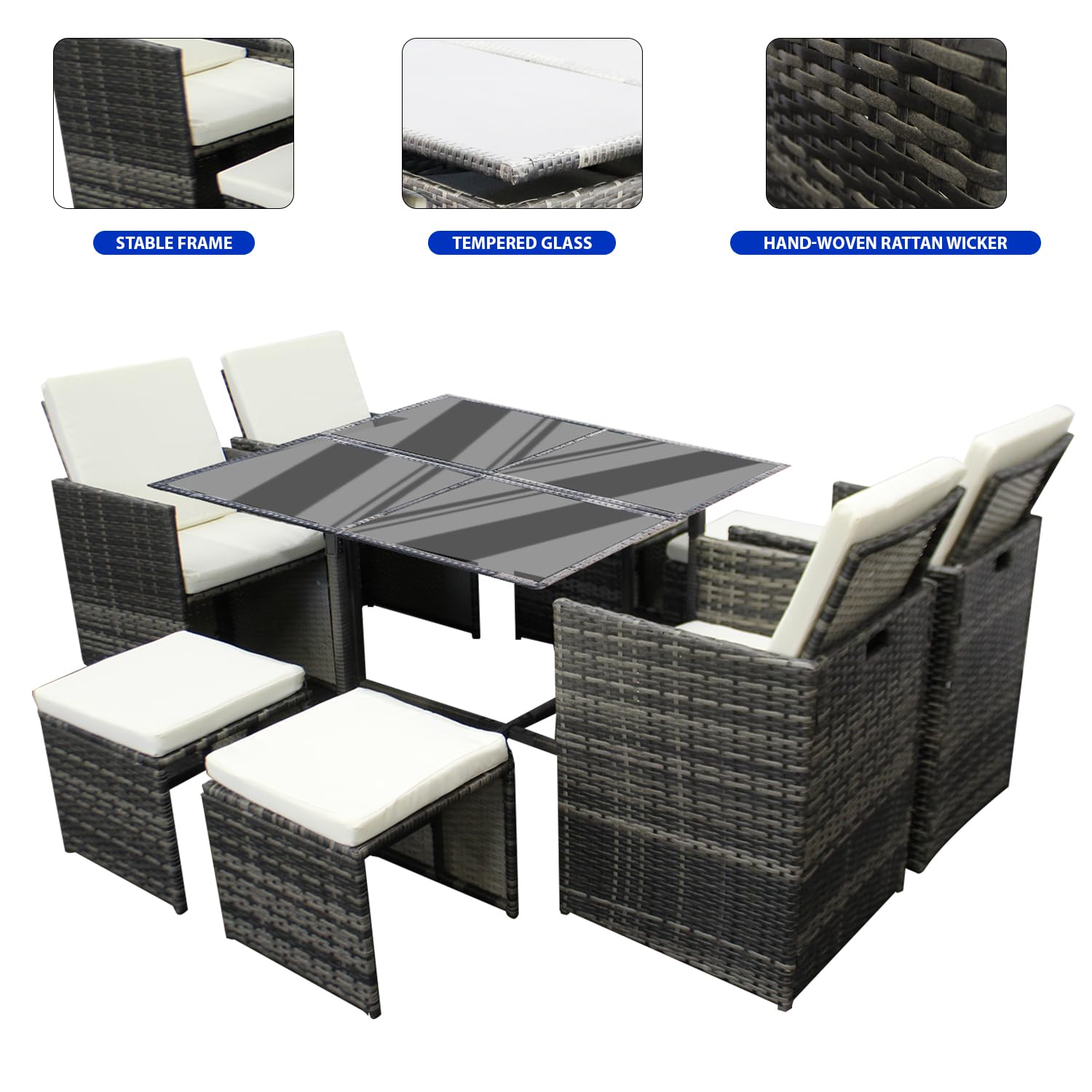 Rattan Garden Furniture Set with Cube Dining Table Chairs Stool 8 Seaters for Outdoor Patio 6141-B (Dark Grey)