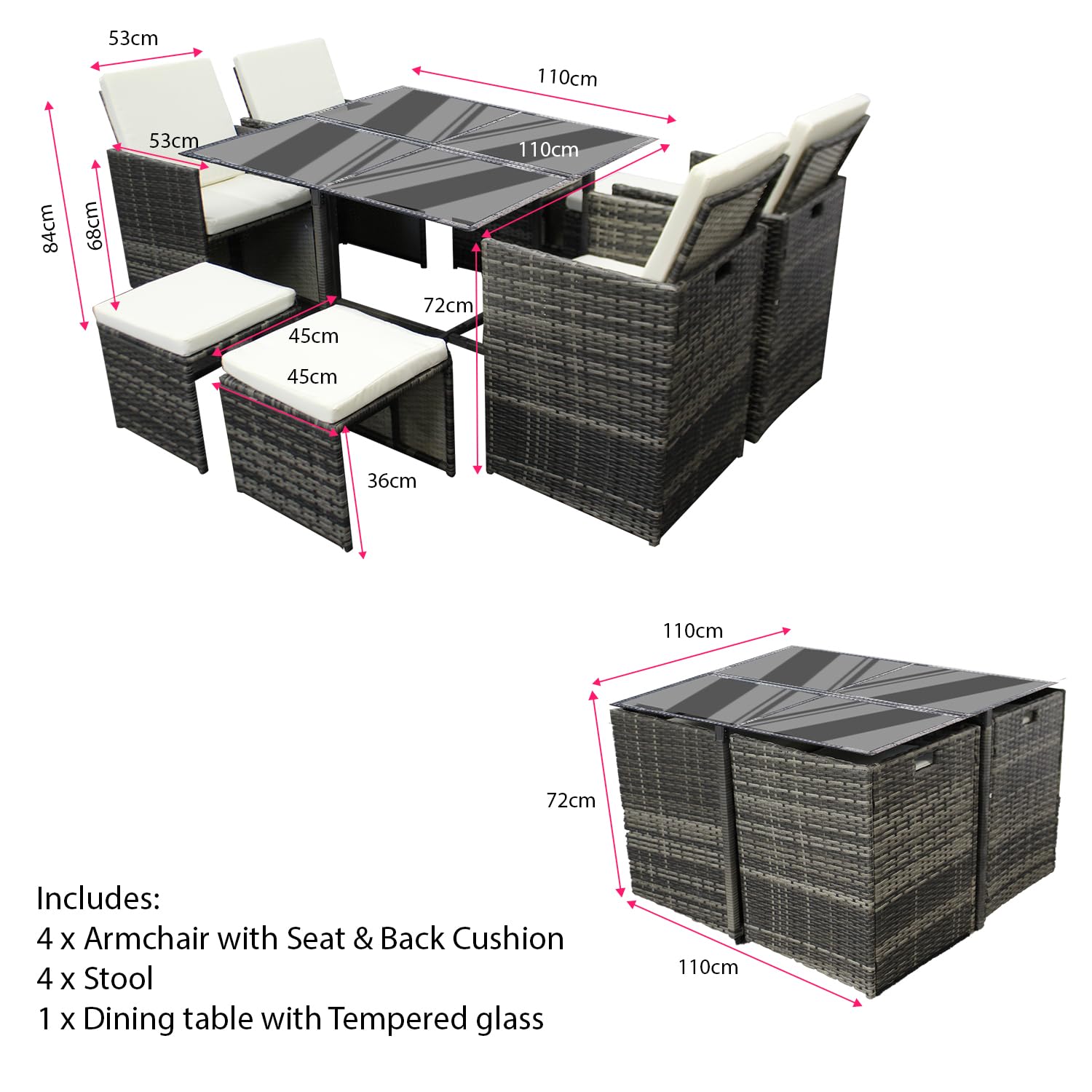 - DIMENSION – (L*W*H) 4 x Armchair with Seat & Back Cushion: 53*53*84cm; 4 x Stool: 45*45*36cm; 1 x Dining table with Tempered glass: 110*110*72cm