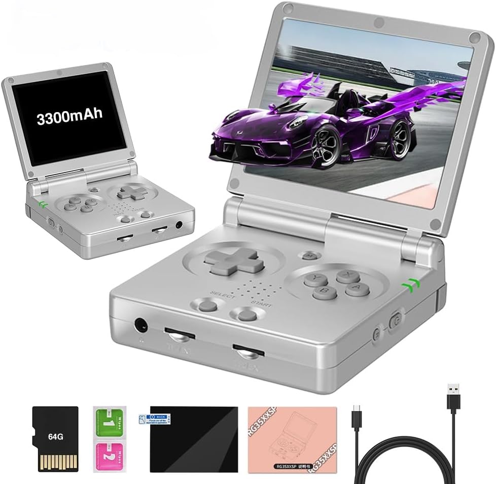 - 【Multiple Emulators And 5000+ Classic Games】RG35XXSP hand held game consoles Built-in with a 64 TF Card and preloaded with over 5000+ games, supports dual TF extend 512GB, Compatible with more than 30 emulators. Support users to download games in relevant formats. Linux System can add emulators and games with related format.