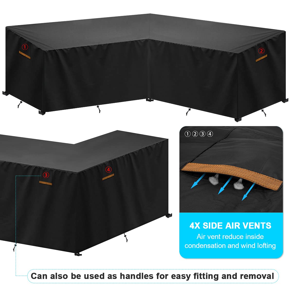 - ▶【4 Hidden Air Vents】There are four Air Vents lined with mesh barriers on one L-shape garden furniture cover, it can efficiently reduce the humidity and avoid moisture and odors caused by a long time cover. The hidden ventilation slots on the four sides can also be used as handles for easy installation and removal.