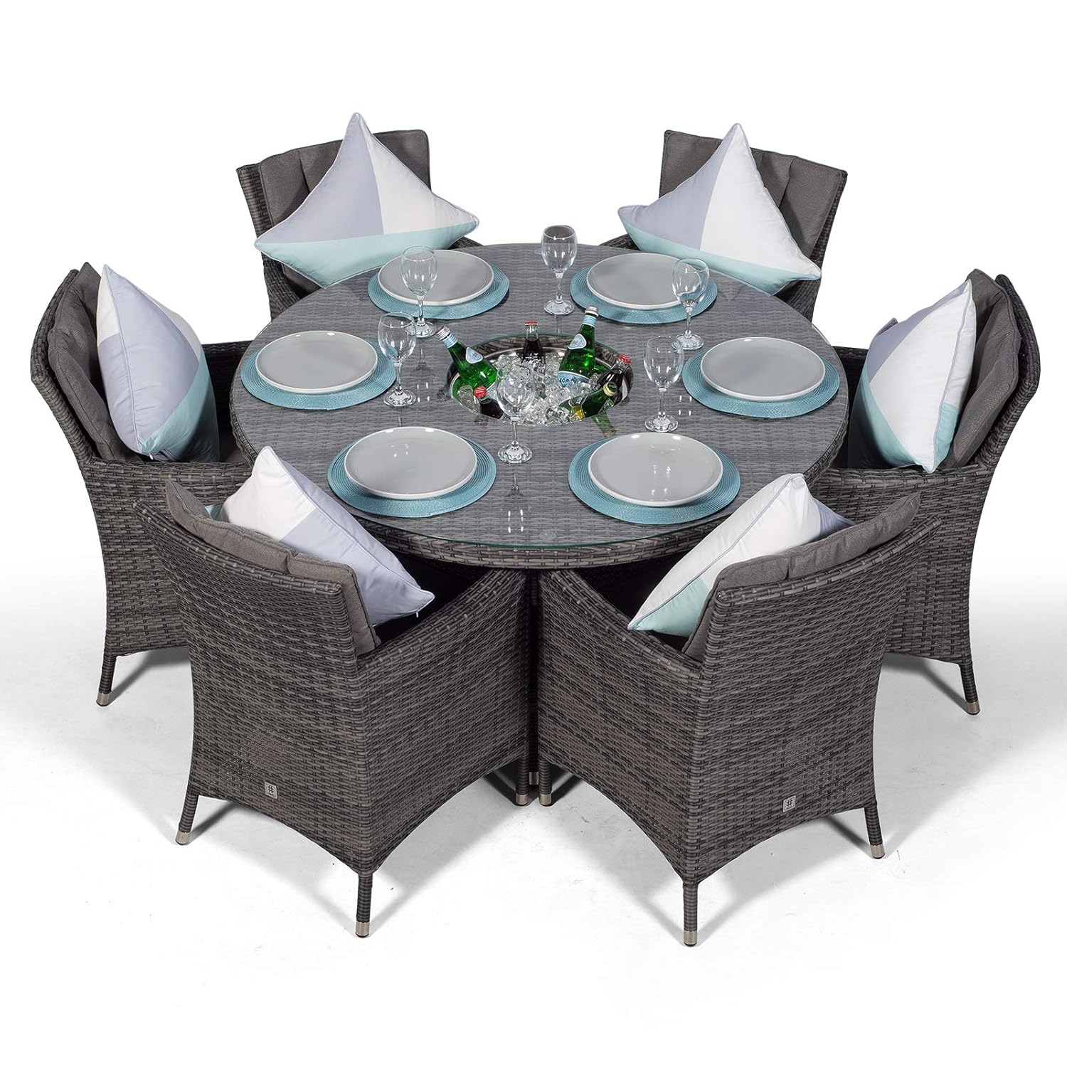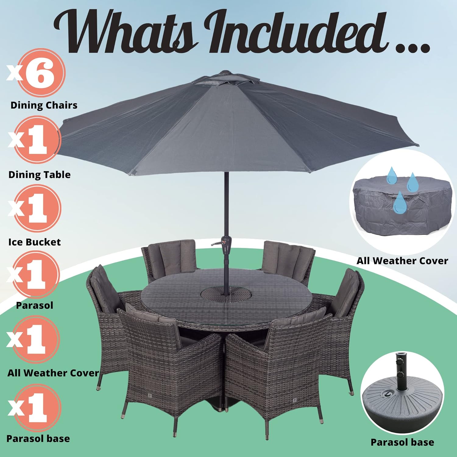 - EVERYTHING YOU NEED FOR ENTERTAINING – The 6 seater rattan dining table features a built in drinks cooler providing the perfect setting for alfresco family meals. Simply fill with ice and enjoy chilled drinks all day long, great for hosting parties and barbeques. The ice bucket drinks cooler features an integrated parasol holder to allow use of the umbrella whilst using the drinks cooler and the wind up crank mechanism makes folding the umbrella easy