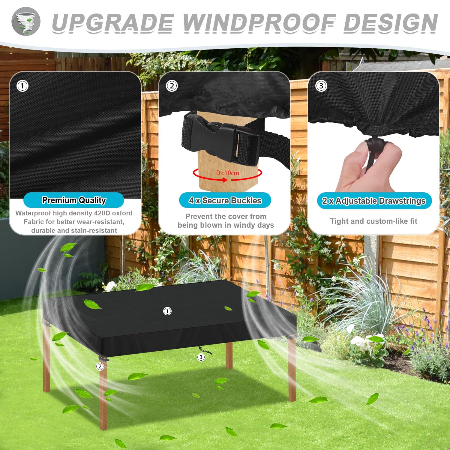 - [Functionality] The garden furniture cover comes with 4 click-lock straps at the bottom and 2 adjustable drawstrings. Fastened click straps on the furniture’s legs and tightened drawstrings for preventing the cover to fly during windy weather