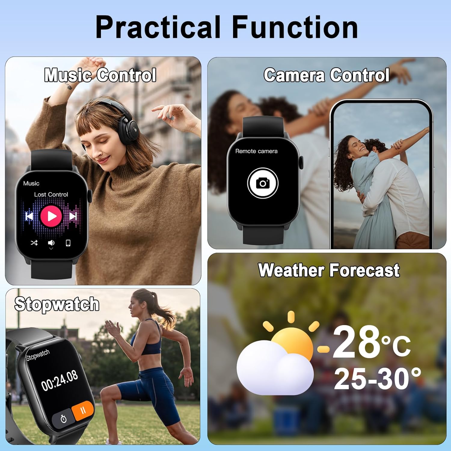 - Long Battery Life and More Practical Functions: Mens watch with its large-capacity battery, it only takes 2 hours to provide 5-7 days of usage and approximately 30 days of standby time. Compatible with most Android 4.4 and iOS 9.0 or above smartphones. Additionally, the ladies smart watch boasts several features such as weather forecast, camera control, music control, Stopwatch, Timer, Calculator, Alarm Clock and find phone, along with more surprising features for you to experience.