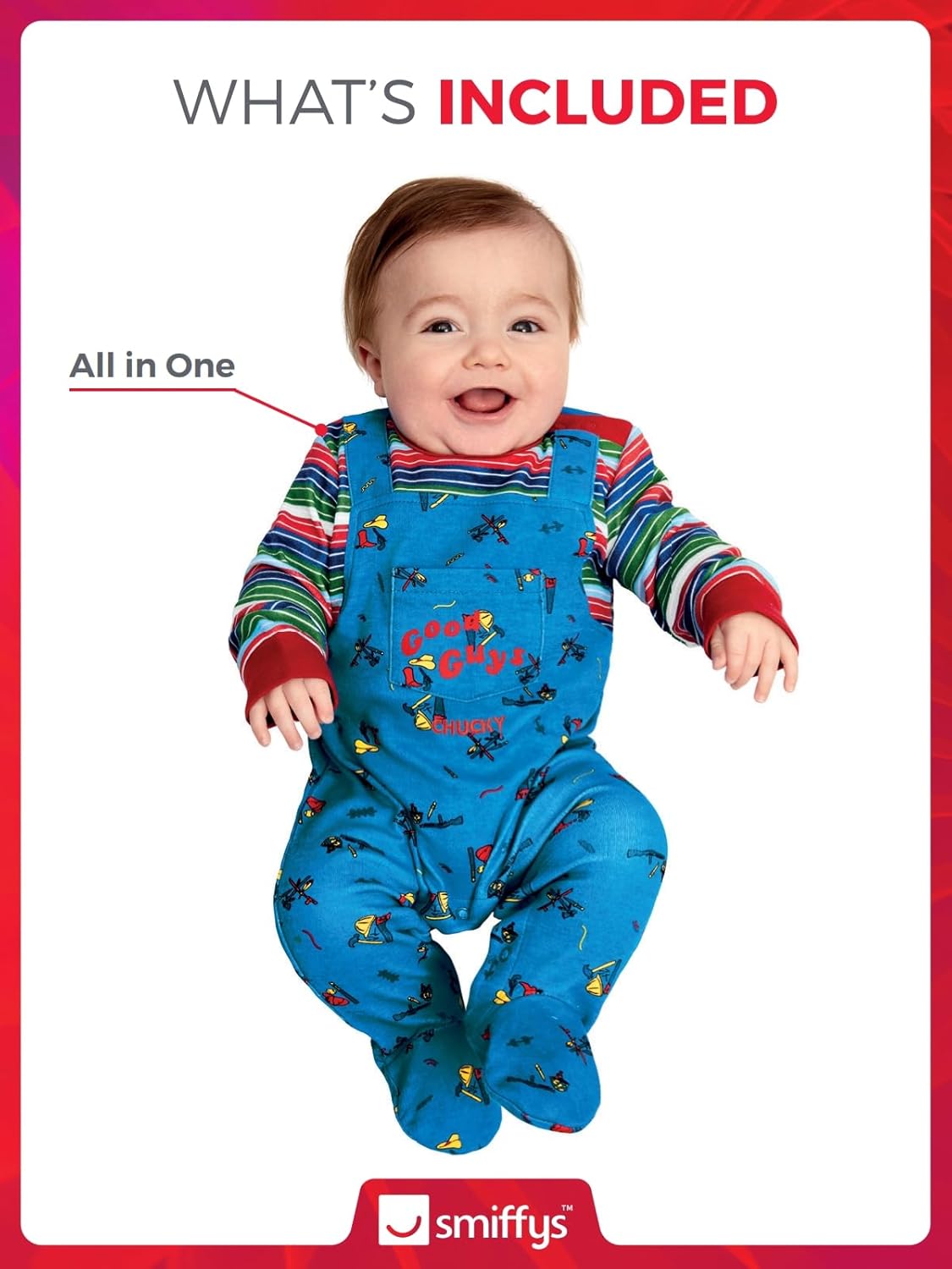 - OFFICIALLY LICENSED CHUCKY BABY COSTUME: Introduce your little one to the world of horror movies with this adorable yet edgy Chucky costume for babies. This all-in-one outfit is officially licensed and perfectly replicates Chucky’s iconic look, and distinctive “Good Guy’s” patch printed on the front