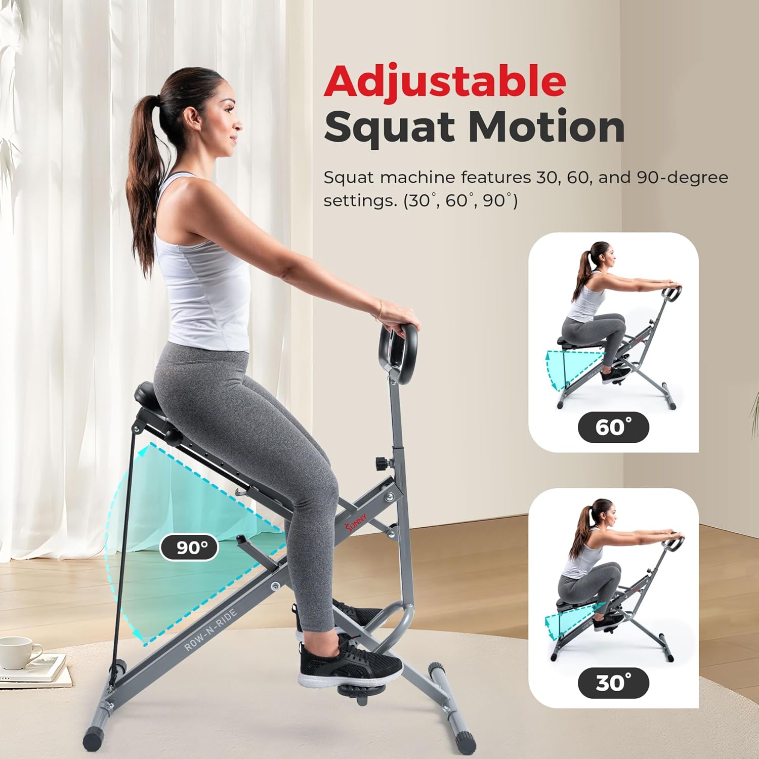 Sunny Health & Fitness Row-N-Ride Squat Assist Trainer, Foldable & Easy Setup Exercise Equipment w/Adjustable Resistance, Home Gym Training Machine for Arm, Glute & Leg Workout,…