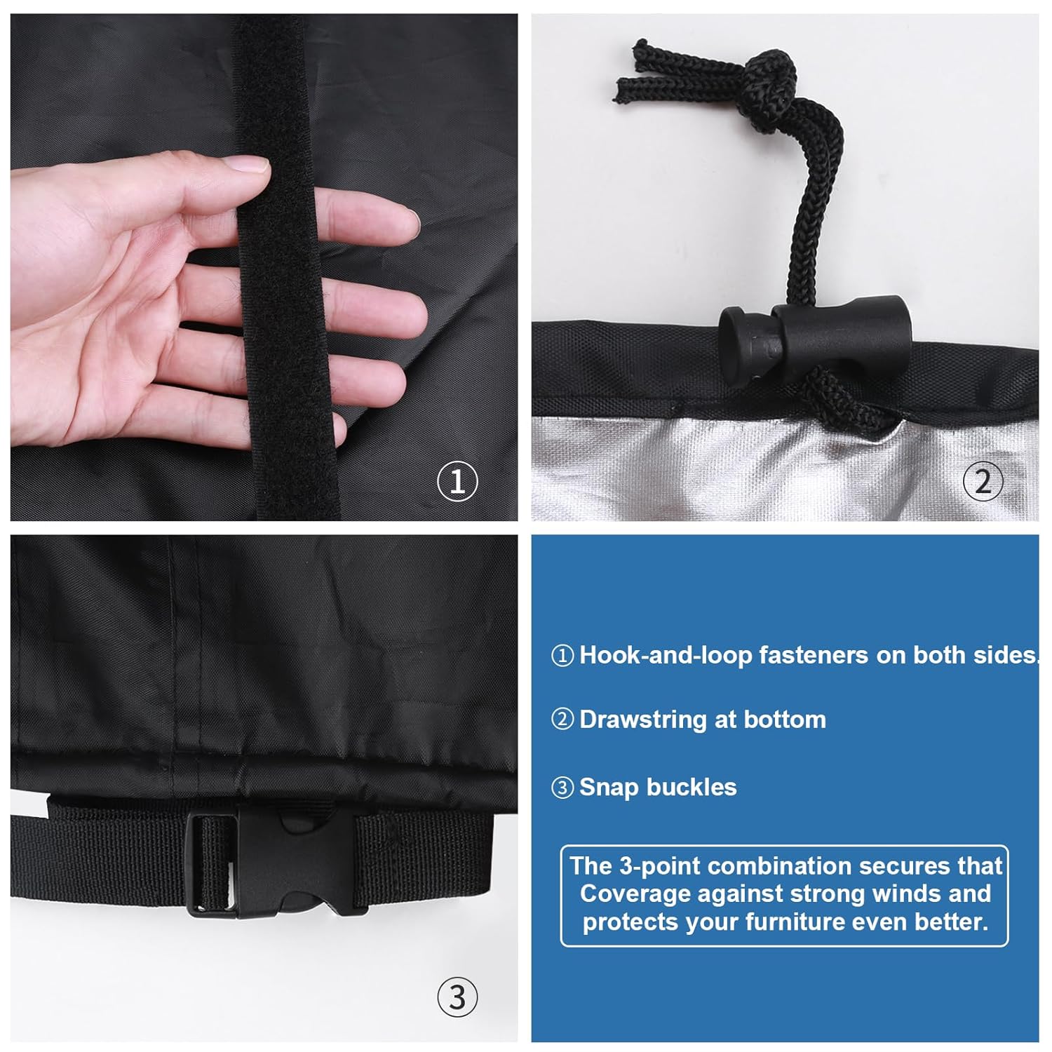 - 【Windproof Design】4 adjustable buckles on the corner and 2 long velcro straps on the side, which can provide great stability during strong winds, keep your chair and table set fastened to stop blowing away. Elastic drawstrings around the hem, with 2 secure buckles, make pulling tightly more convenient, Instead of having to constantly move the material around the hem.