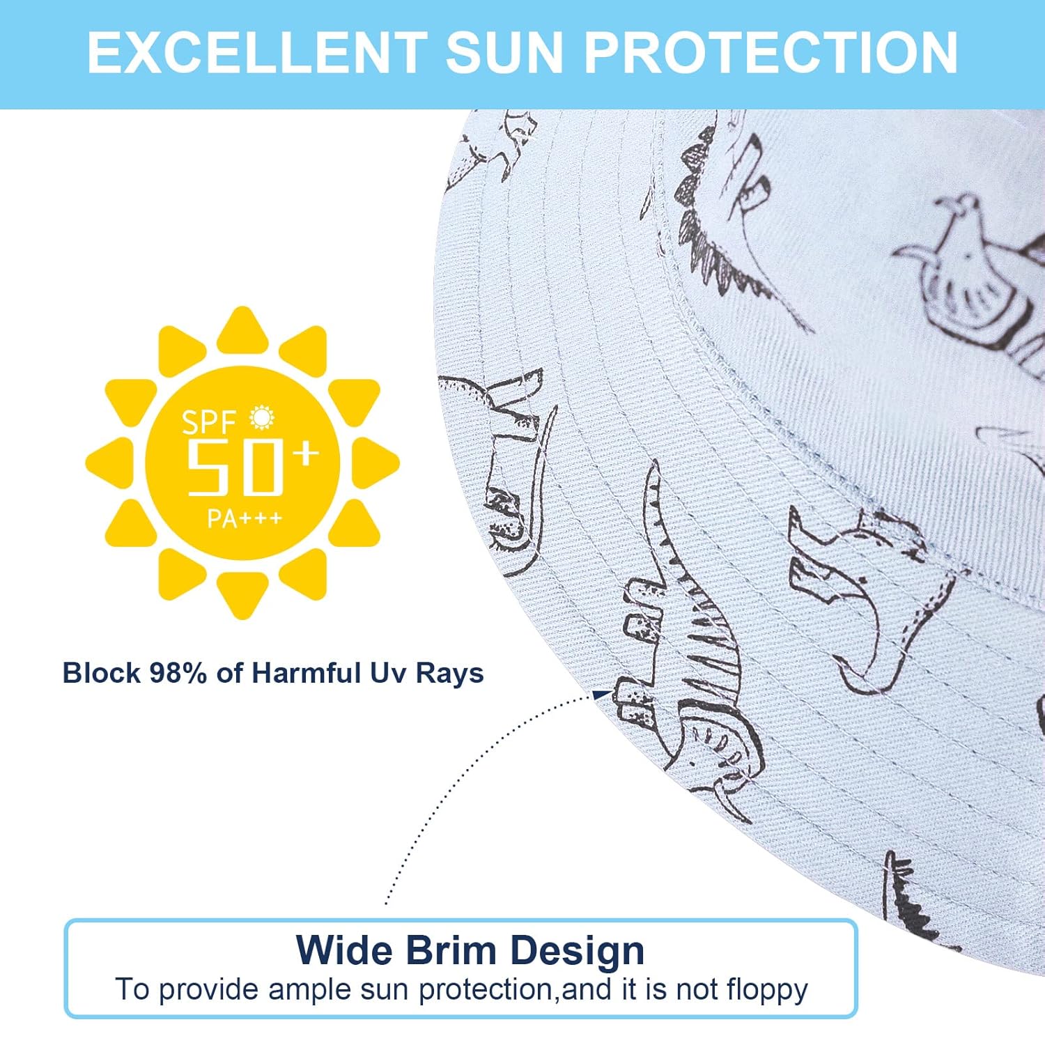 - [100% Cotton Material]: The baby sun hat is made of 100% cotton material, breathable, skin-friendly, lightweight, and printed with cartoon dinosaur prints, washable and durable. The breathable mesh lining greatly keeps baby’s head cool, dry and ventilated.