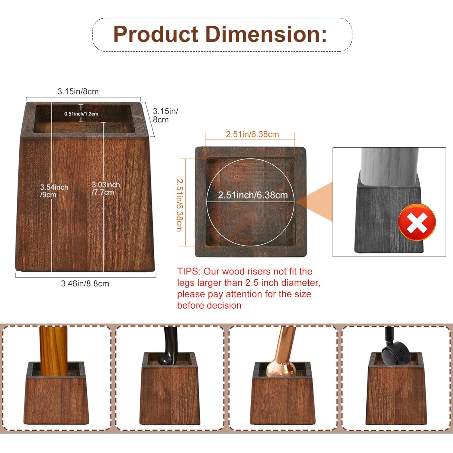 - Size: 8.8 x 8.8 x 9 CM (W*D*H); Recessed hole inner height 7.7H CM (TIPS: Our wood risers not fit the legs larger than 2.5 inch diameter, please pay attention for the size before decision)