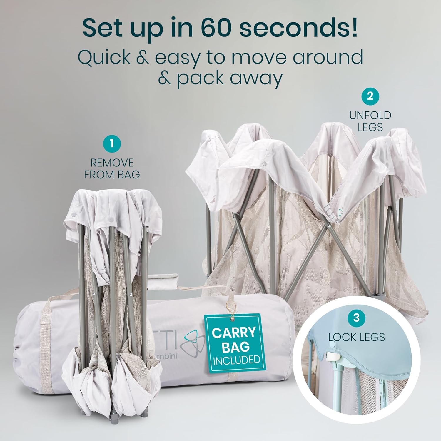 - FOLD AWAY PLAYPEN – Keep your little one safe and entertained as you go about your day with Tutti Bambini’s foldable baby play pen! The pop up play pen neatly fits into the included travel bag, ensuring convenience wherever your adventures take you. *PLAY BALLS NOT INCLUDED