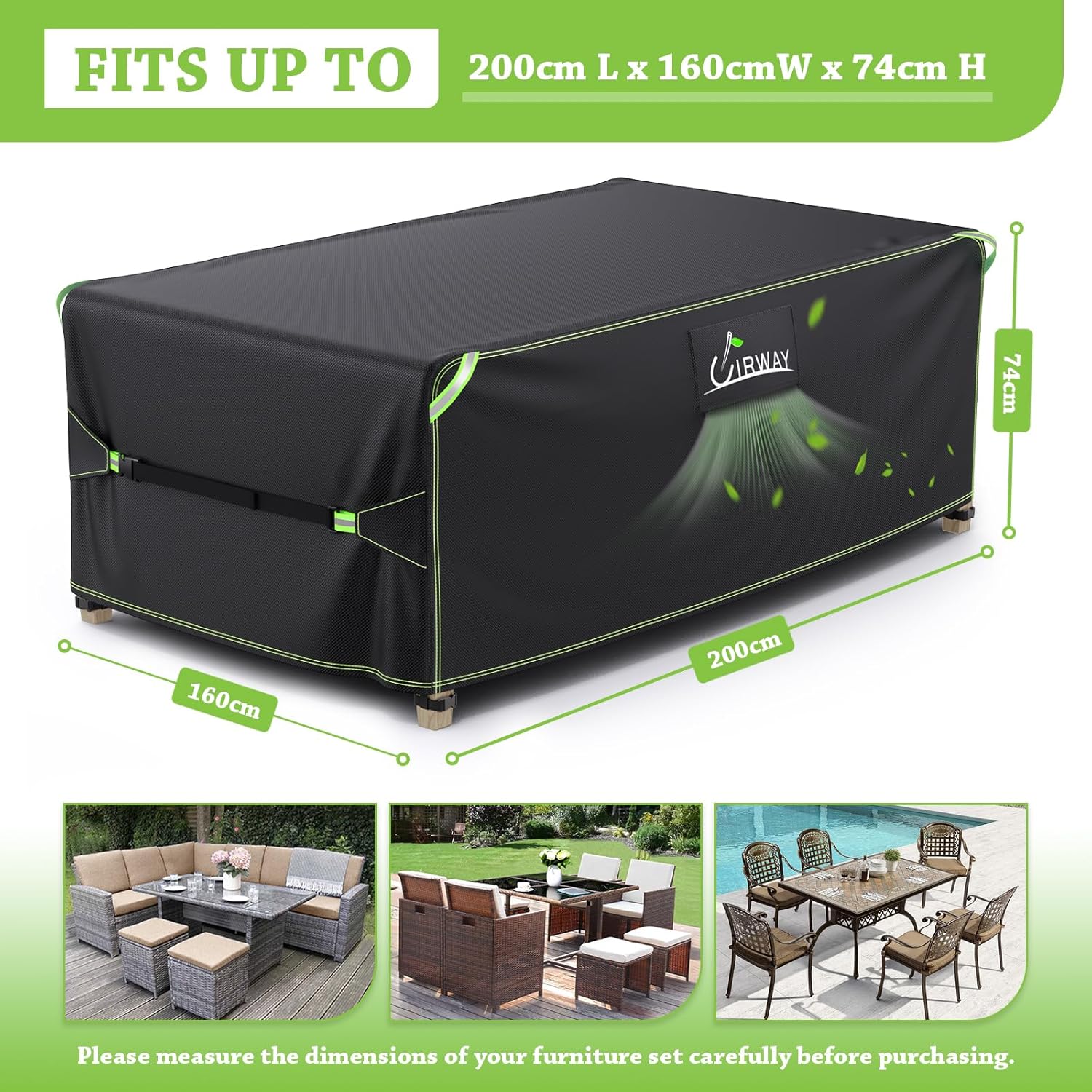 - 【USER-FRIENDLY DESIGN】The garden furniture cover has four reflective handles that can be used for drying and hanging after cleaning which most sellers don’t have. The design of the side reflective strips makes it easy to identify the position of the furniture at night or when the light is low and avoid stumbling.