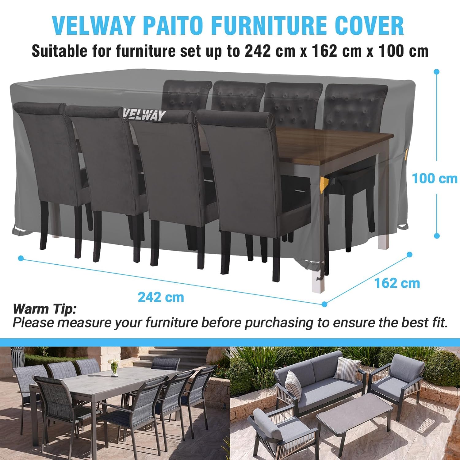 - 【Advanced Material for Superior Protection】- Our Velway garden furniture cover boasts 420D Oxford fabric with a silver-coated interior to effectively shield your furniture from sunlight, rain, and dust. We’ve reinforced inner seams with waterproof tape for complete protection.