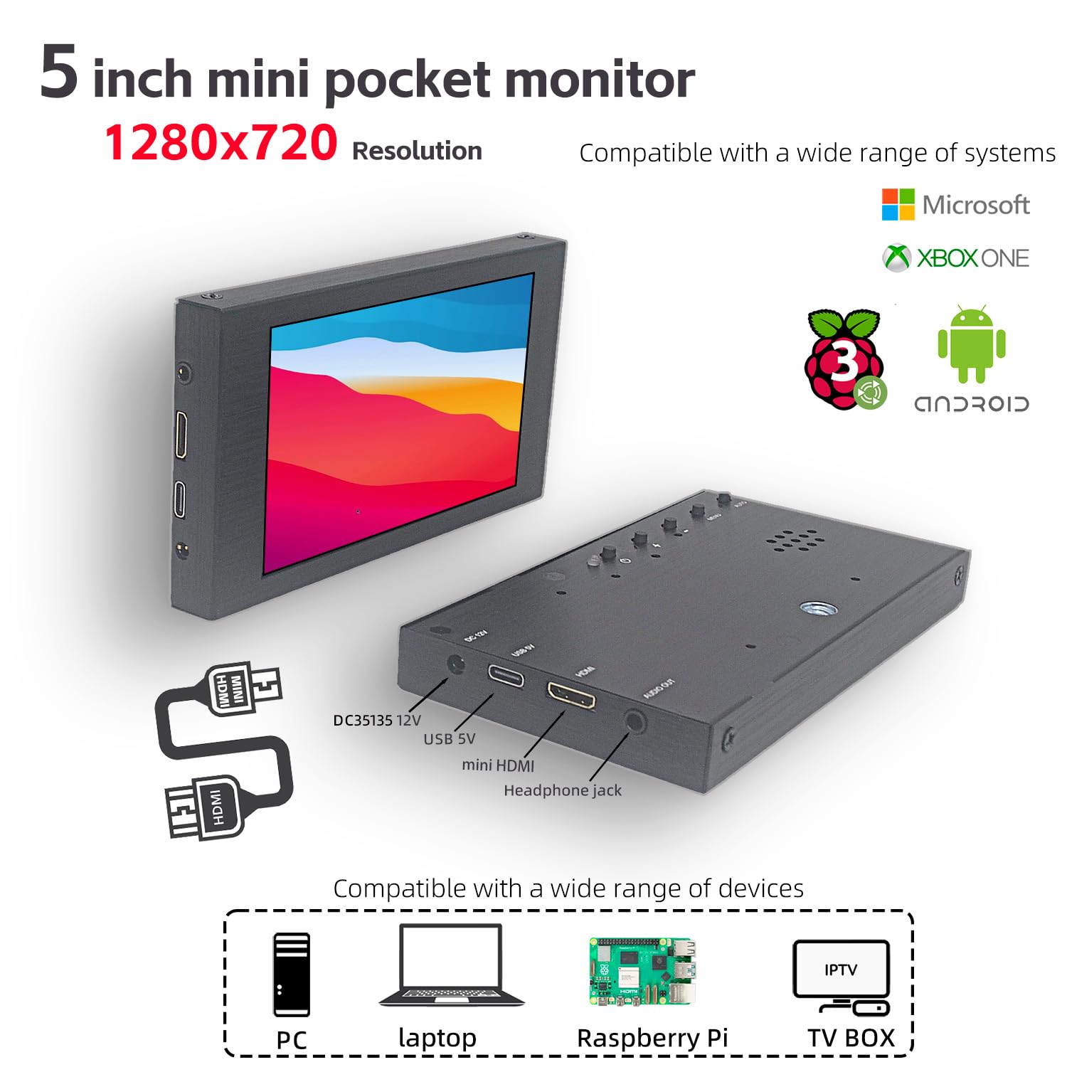 - Mini HD Small Screen: With a resolution of 1280×720, this 5-inch mini display ensures clear and detailed visuals, allowing you to enjoy lively and clear content, and the IPS screen offers a 178° wide viewing Angle to ensure consistent image quality and vibrant colors in almost any viewing position.