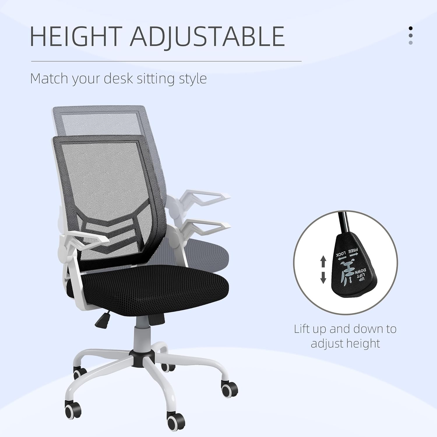 - Adjust your position: You can adjust the mesh chair between 45 and 55 cm to fit your desk height. The flip-up armrests are adjustable to provide support and can be lifted to tuck under the desk when not in use