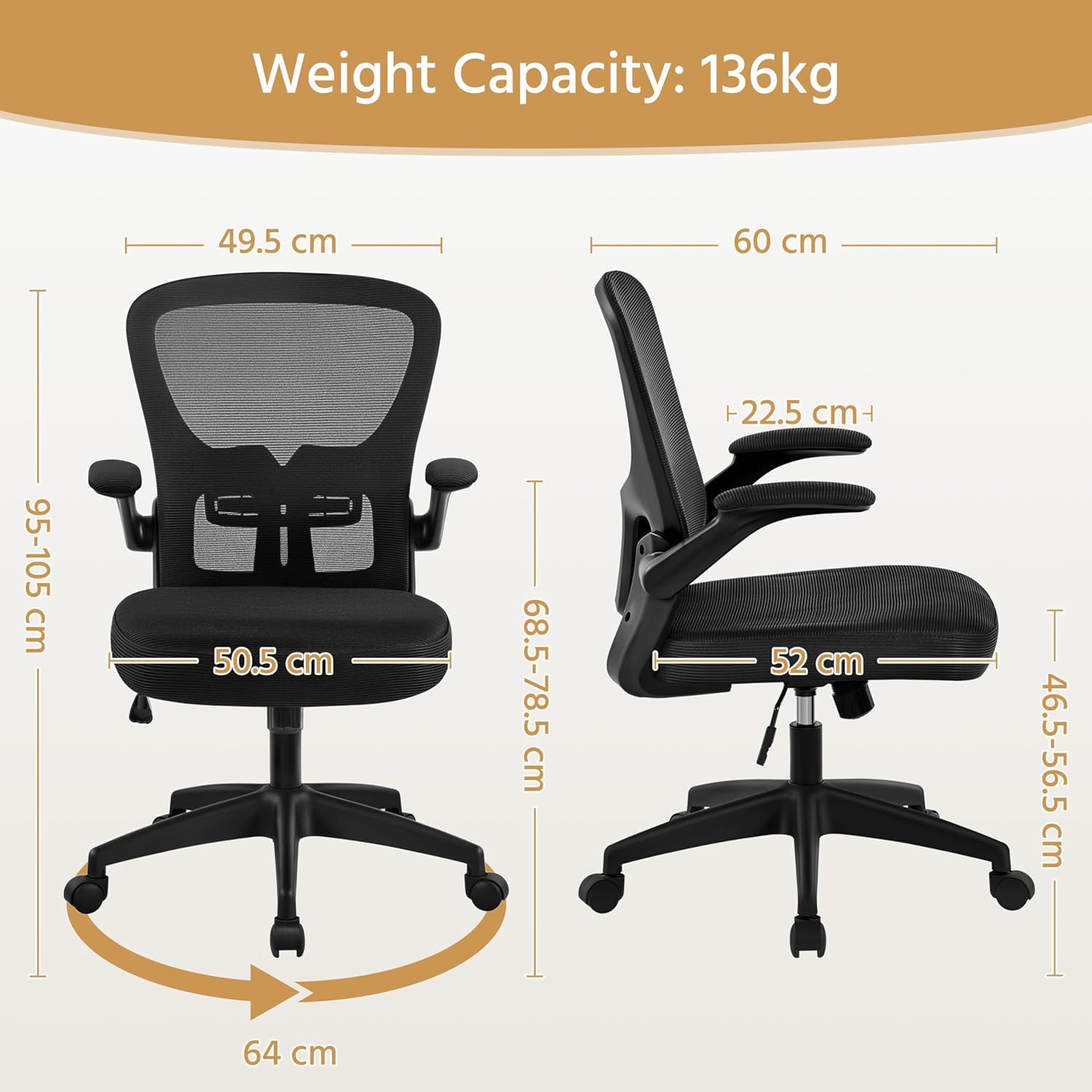 - Large Cushioned Seat & Mesh Back: The seat measures 50.5cm (W) x 52cm (D) and is padded with high-elastic foam, which accommodates different body types and provides a more soft sitting experience. Both the backrest and the seat are covered with breathable mesh that allows air and heat to easily pass through to maintain a comfortable temperature during office and study hours.