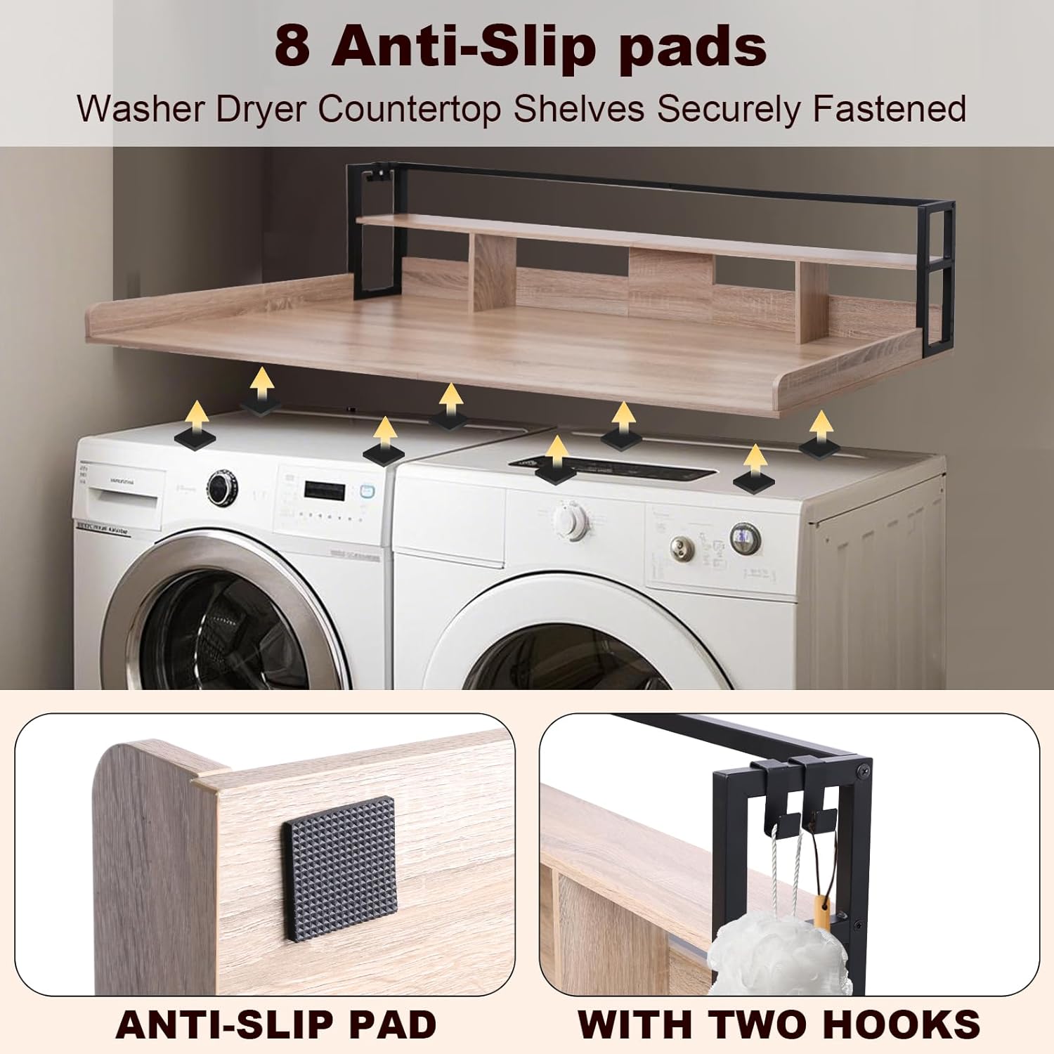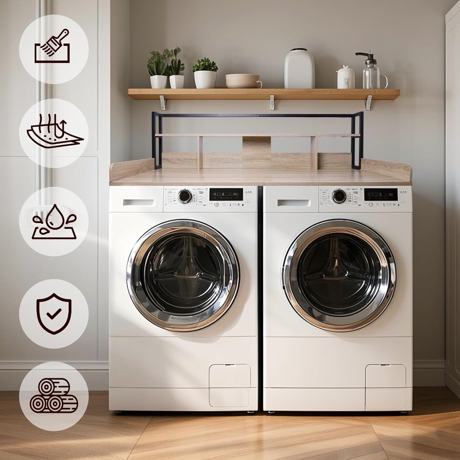 - High Load-Bearing Reinforcement Design: Washer dryer countertop is made of high-pressure decorative laminate and P2 grade CARB board, real wood feel, very stable and durable, can hold up to 250 pounds, long life, two-layer design, and provides plenty of workspace for all your laundry needs