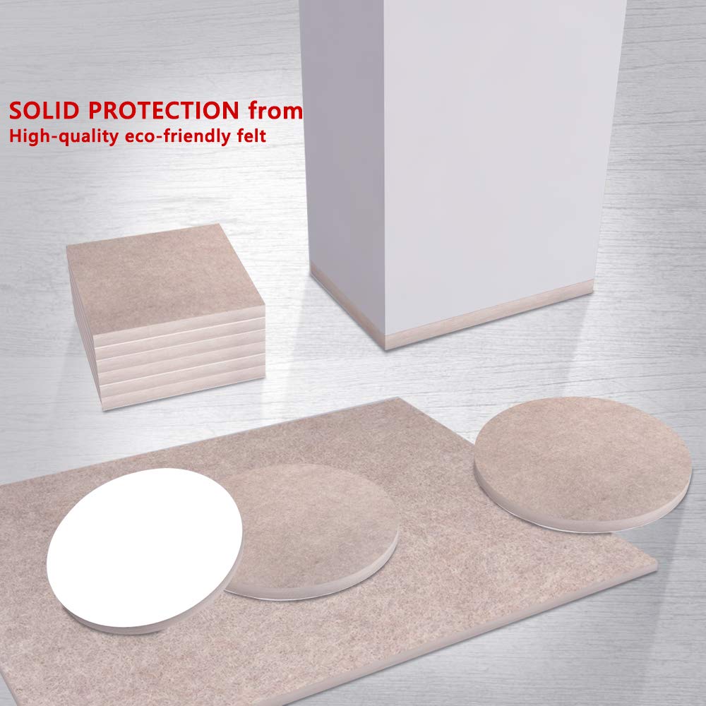 - PREMIUM MATERIAL & SUPER DURABLE – Our furniture pads are made of thick felt with recycled fibers. Tenacious adhesive guaranteed You can easy stick it to any furniture surface and be sure it will hold on and protect for a long time.
