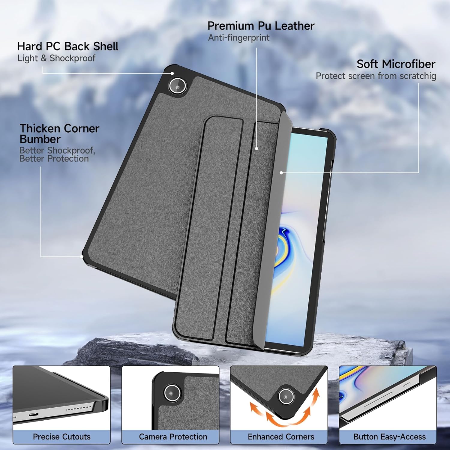 - High-Class Material: Exterior front Synthetic Leather cover for anti-scratch, Interior Soft Microfiber for friendly screen protection, also Hard PC Back Shell with 4 corners buffer, protection tab a9 from every details
