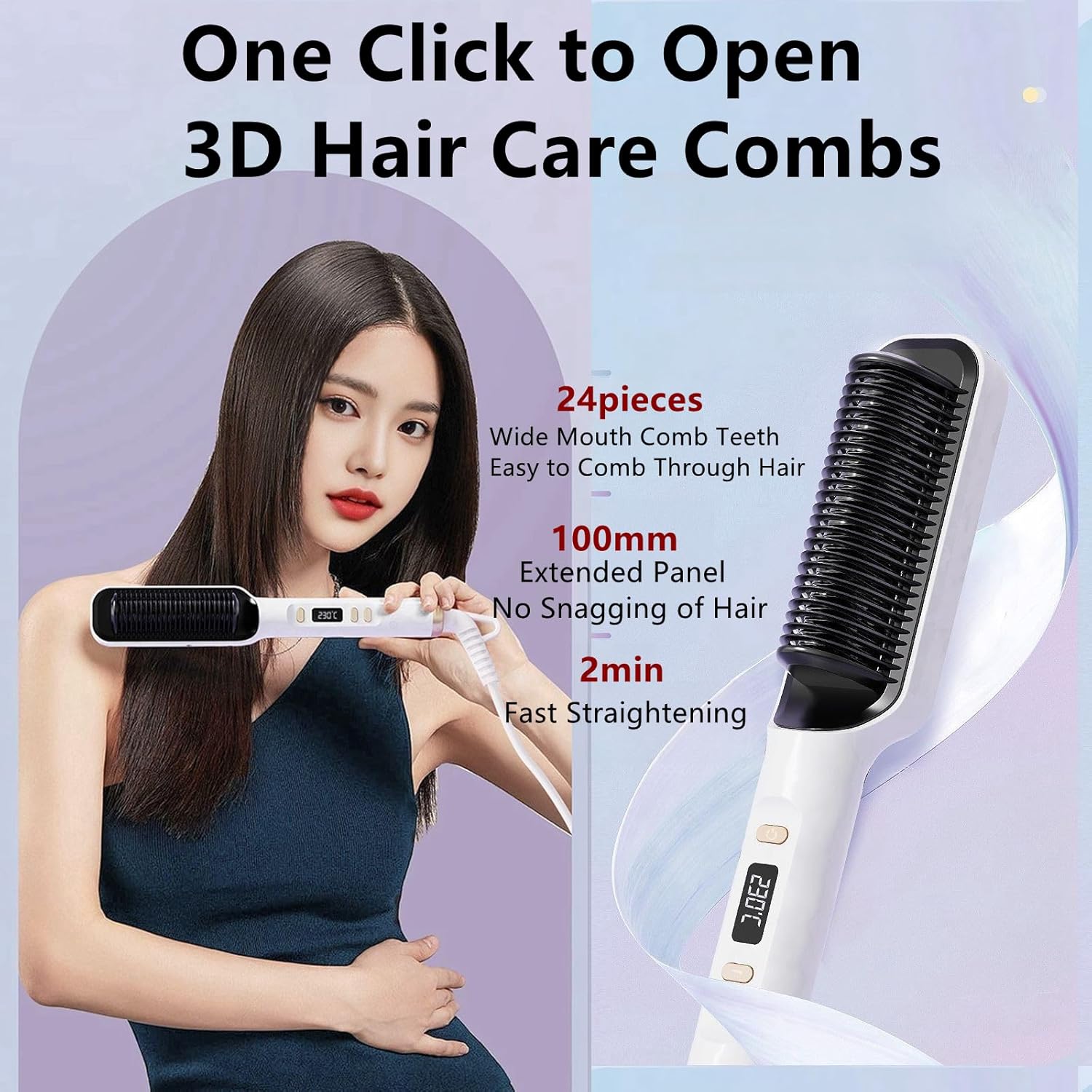 - 【Release Negative Ionic Hair Care】Hair Straightening Comb features an ionically charged design and tourmaline ceramic material, release Negative Ionic to help keep hair silky smooth, repair damage and breakage, and make split ends and flyaways a thing of the past. 3D Comb tooth and PTC heating technology deliver even heat, reducing heat damage by 50% for a salon-quality finish without frizz;