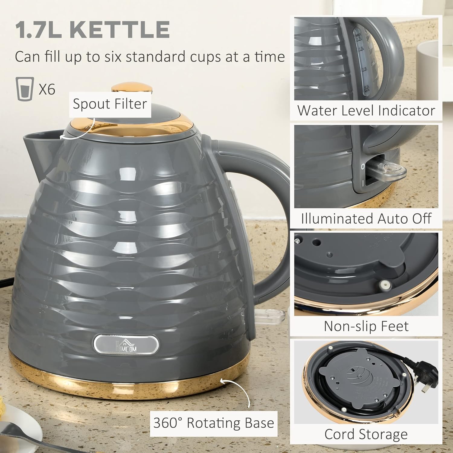 HOMCOM Kettle and Toaster Sets, 3000W 1.7L Rapid Boil Kettle & 4 Slice Toaster with 7 Browning Controls, Defrost, Reheat and Crumb Tray, UK Otter Thermostat, Grey