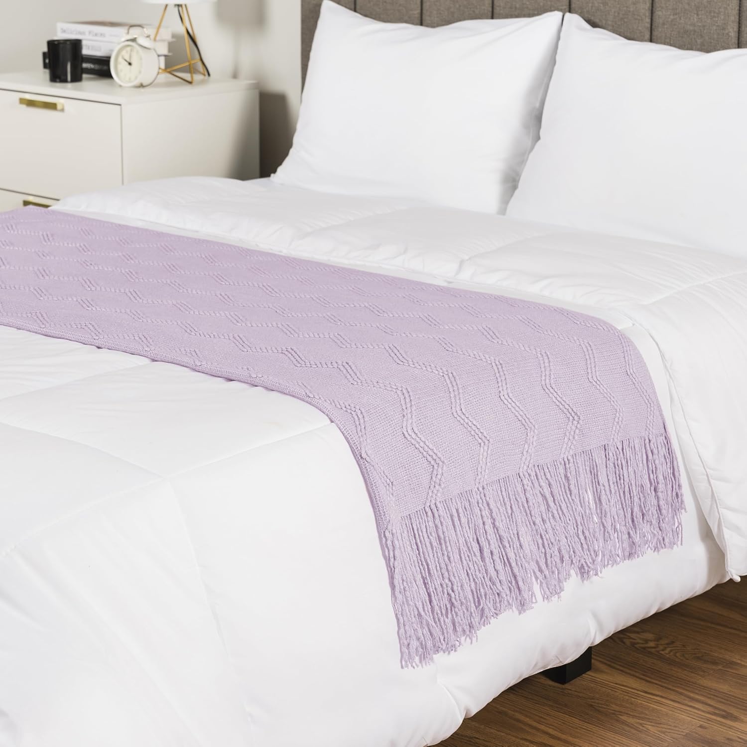 - LAVENDER PURPLE KNIT THROW BLANKET: Measures 50 x 60 inches, this knitted blanket with fringe tassel is made of 100% premium acrylic that is lightweight yet super soft and cozy. Perfect for all seasons, the throw blanket knit is silky smooth to touch, and ideal as a home decor for living room, couch, sofa and bed.