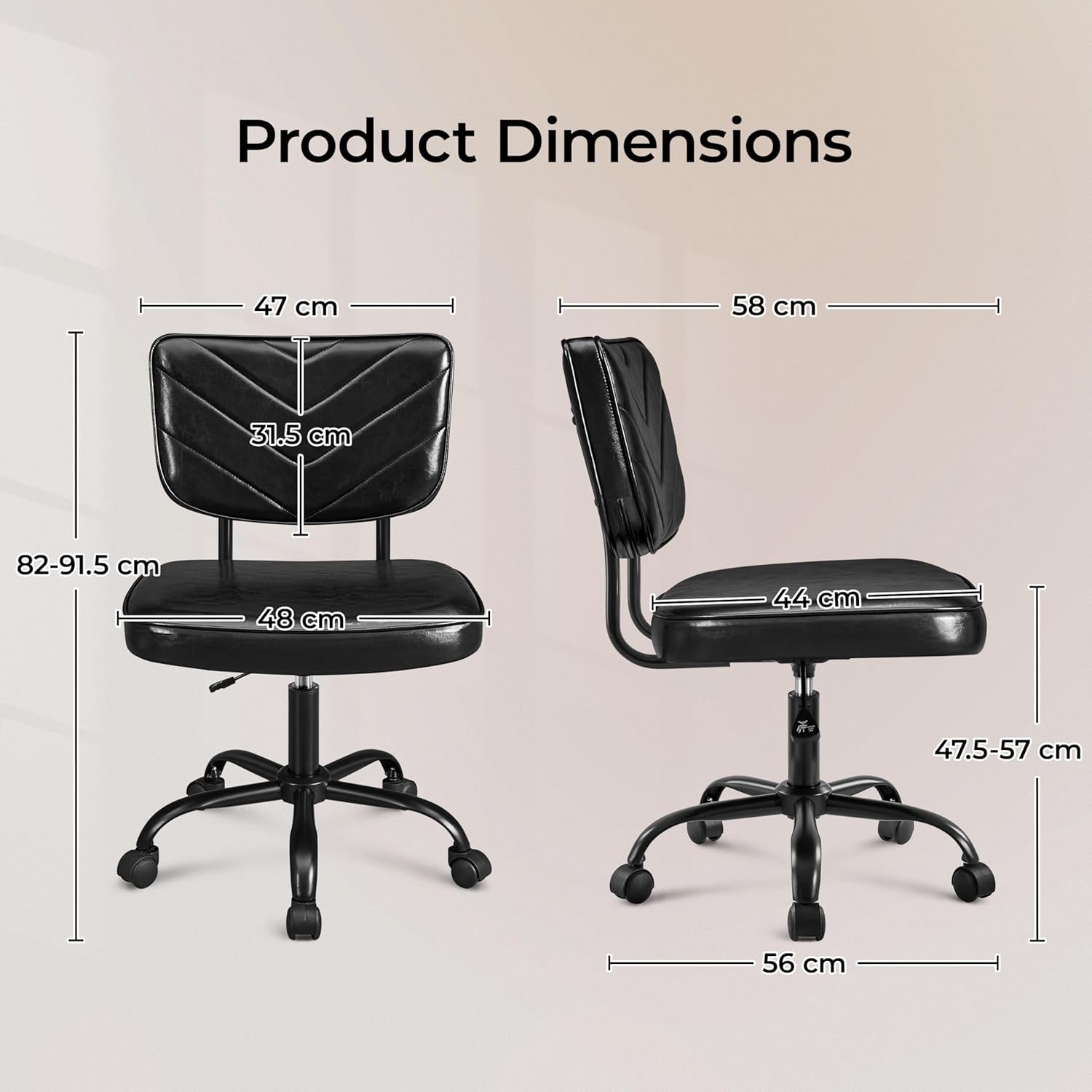 - Smooth Mobility & Adjustable Height: This armless chair features five swivel nylon wheels for effortless movement between tasks. The seat height adjusts from 47.5 to 57 cm, allowing easy adaptation to different desk heights and ensuring customized comfort